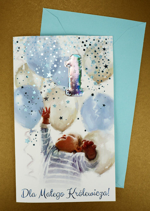 Karnet z życzeniami i kopertą, posiada ozdobne wytłoczenia, które błyszczą się w świetle. Dodatek niebieskich, błyszczących gwiazdeczek nadaje całości uroczego wyglądu. Wewnątrz karnetu ozdobny środek i wyjątkowe życzenia. "W dniu tak pięknym i wspaniałym życzę Ci serduszkiem całym dużo zdrowia sto lat życia, moc zabawek do zdobycia!" Format: 11,5x19 cm