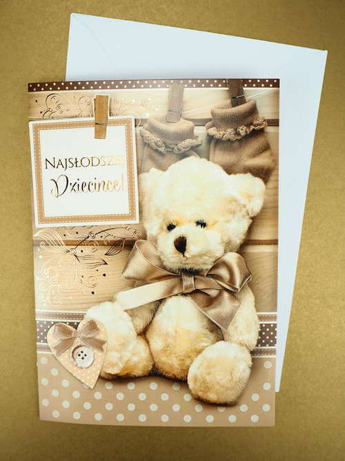 Karnet z kopertą z okazji urodzin dziecka. Wytłaczany nadruk misia imitujący futerko. Błyszczące, metaliczne elementy nadają całości uroku. Wewnątrz ozdobny środek zżyczeniami. "Słodkie chwile Twoje, gdy przy sercu Mamy drzemiesz, gdy przez oczka małe swoje, pierwsze kolory dostrzeżesz. Aby przez całe przyszłe życie, zdrowia Ci nie brakowało, aby ułożyło się w dobrobycie, i radością opływało!" Format: 13,5x19 cm