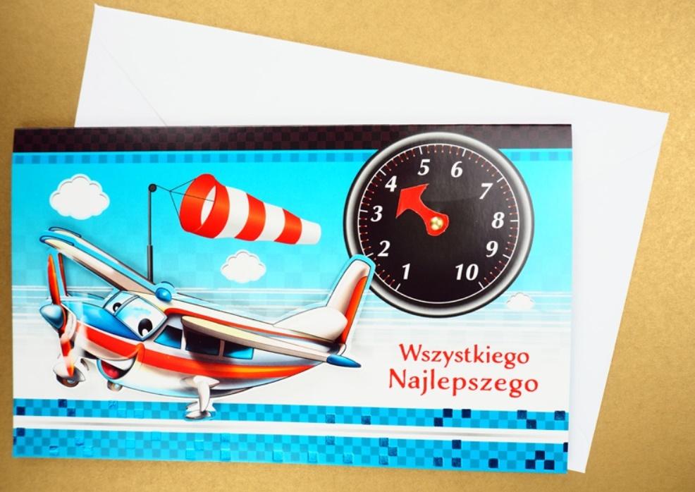 Kolorowy karnet z chłopięcym motywem. Zdobiony metalicznymi elementami odbijającymi światło. Na środku samolot 3D. Możliwość ustawienia weku jubilata od 1 do 10. Wewnątrz kolorowy środek i życzenia. "Idzie misio, idzie konik, małpka, piesek no i słonik. Wszyscy razem z balonami, z najlepszymi życzeniami. Bo to dzień radosny wielce -masz znów jeden roczek więcej! Format: 19x11,5 cm