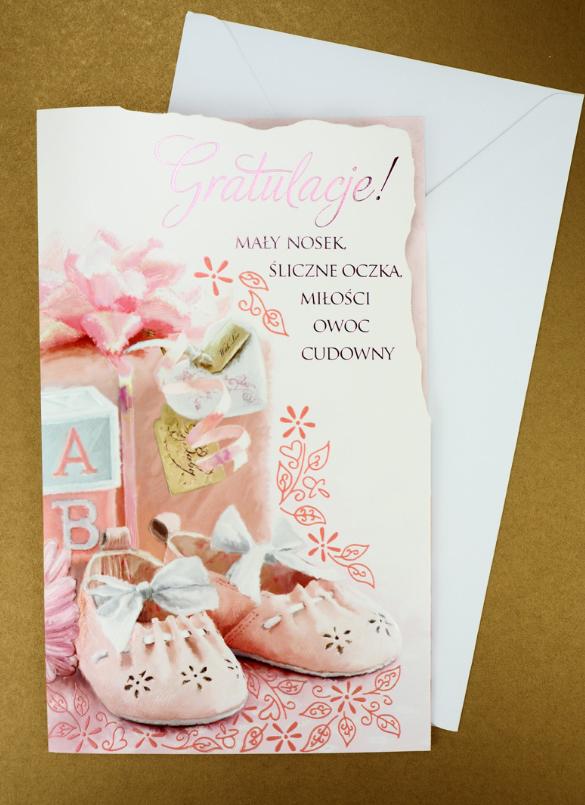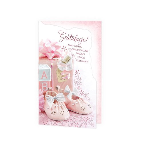 Karnet z życzeniami i kopertą, posiada ozdobne wytłoczenia, które błyszczą się w świetle. Wewnątrz karnetu kolorowy środek i wyjątkowe życzenia. "Życzę Ci, Najmniejsza Kruszynko, pogodnego dzieciństwa, śmiechu w domu i lodów w niedzielę, i przyjaciół najlepszych na świecie, i życia z fantazją, mądrego i dobrego, i wszystkiego, wszystkiego najlepszego!" Format: 11,5x19 cm