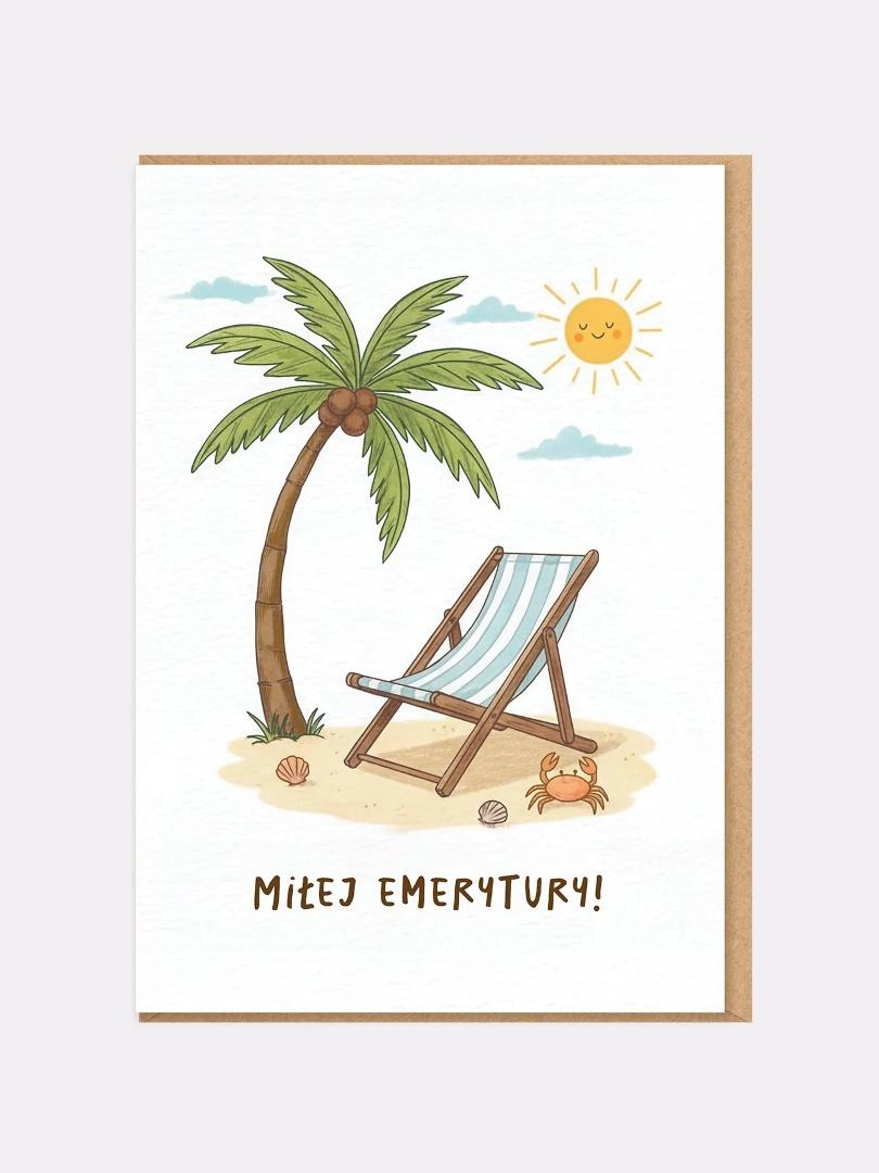 Rysunek jest lekki i pełen uroku: palma, plaża, muszelki i leżak czekający na zasłużony relaks. To kartka na emeryturę, która zamiast patosu wybiera uśmiech i dobrą energię. Sprawdzi się jako prezent dla współpracownika odchodzącego z pracy, dla szefa, nauczyciela, rodzica lub bliskiej osoby rozpoczynającej nowy rozdział w życiu.