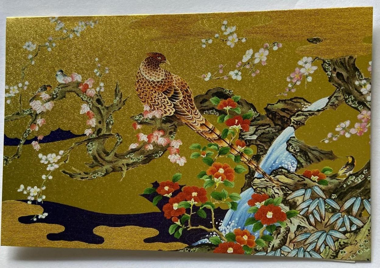 Elegancki japoński karnet premium z piękną, artystyczną ilustracją. Przedstawia majestatyczną scenę na złotym tle, gdzie centralnym elementem jest piękny, kolorowy bażant siedzący na gałęzi. Kompozycję wzbogacają kwitnące gałęzie wiśni i czerwone kwiaty, wśród których pojawiają się mniejsze ptaki. Całość otoczona jest fantazyjnymi skałami, bambusem i subtelnymi elementami klasycznego japońskiego krajobrazu. Karnet w zestawie z kopertą, bez tekstu w środku.