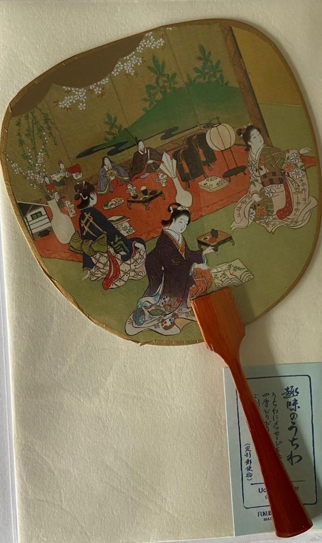 Elegancki japoński karnet premium z piękną, artystyczną ilustracją. Przedstawia tradycyjny japoński wachlarz (uchiwa) w kolorze złocisto-żółtym. Na powierzchni wachlarza znajduje się barwna, dynamiczna scena z klasycznej japońskiej sztuki grupa postaci w historycznych strojach, z czerwonymi flagami i proporcami, przedstawiona w stylu ukiyo-e. Ilustracja jest pełna detali, ruchu i charakterystycznego dla epoki Edo uroku.Karnet w zestawie z kopertą, bez tekstu w środku.