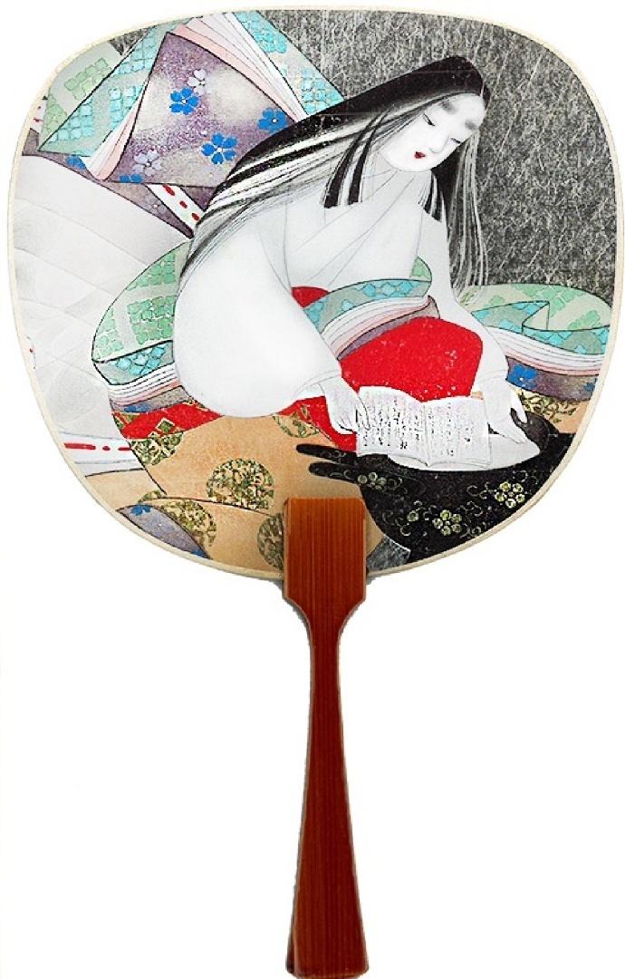 Elegancki japoński karnet premium z piękną, artystyczną ilustracją. Przedstawia tradycyjny japoński wachlarz (uchiwa) w kremowo-beżowym kolorze. Na powierzchni wachlarza znajduje się abstrakcyjno-dekoracyjna kompozycja w stylu ukiyo-e, przedstawiająca fragmenty tradycyjnych japońskich domów, dachy z niebieskimi i czerwonymi akcentami oraz geometryczne wzory. Karnet w zestawie z kopertą, bez tekstu w środku.