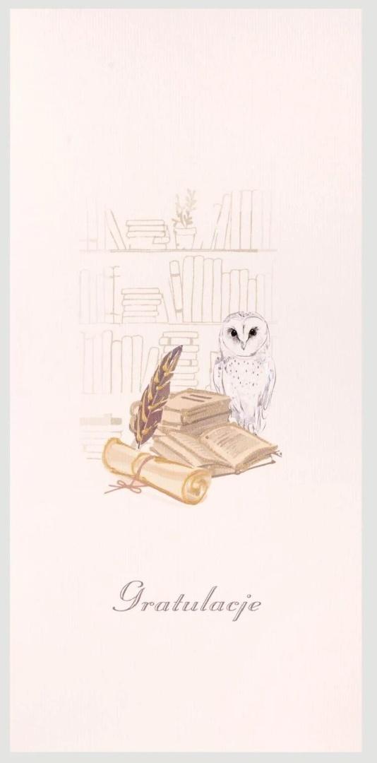 Kartka ręcznie robiona z grafiką sowy wśród książek z napisem "Gratulacje". Świetnie sprawdzi się, w roli złożenia życzeń na zakończenie szkoły czy uzyskanie dyplomu (absolutorium). Kartka jest stonowana kolorystycznie, a dzięki zdobieniom złotometaliczną farbą akrylową nabiera szlachetnego charakteru. Złóżcie swoje najlepsze życzenia osobie, która właśnie ukończyła ważny dla niej życiowy etap. W zestawie znajduje się dopasowana koperta. Wyprodukowana w Polsce.