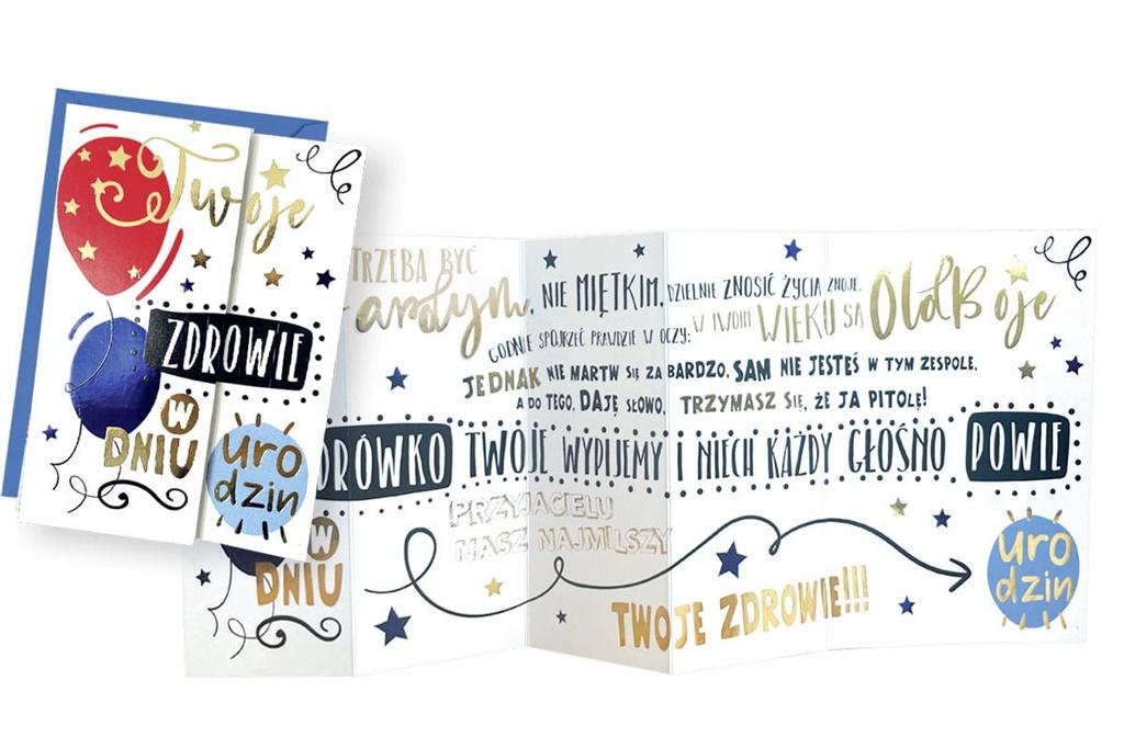 Rozkładana karta w formie harmonijki z kolorowymi życzeniami w środku to świetny pomysł na piękną pamiątkę. Każda kartka HR ma kolorowe wnętrze z tekstem wyjątkowych życzeń i grafiką, jest zdobiona dwiema metalicznymi foliami w różnych kolorach, a w komplecie posiada dopasowaną kolorystycznie kopertę. Cechy szczególne: wielkość: B6, 16.6 x 11.7 cm po złożeniu, długość kartki po rozłożeniu to 40 cm koperta: dopasowana w zestawie, zdobienia: dwie metaliczne folie w różnych kolorach wnętrze kartki: kolorowe, z życzeniami, okazja: urodziny