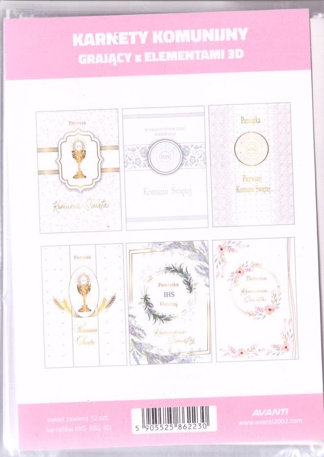 Karnety A5 z elementami 3D grające melodię "Pan Jezus już się zbliża". Opakowanie zbiorcze 12sztuk zawiera mix wzorów.