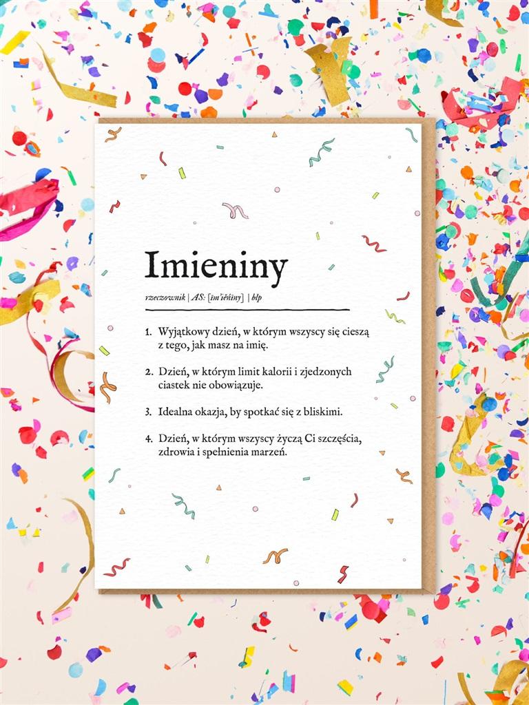 Imieniny: Wyjątkowy dzień, w którym wszyscy cieszą się z tego, jak masz na imię. Dzień, w którym limit kalorii i zjedzonych ciastek nie obowiązuje. Idealna okazja, by spotkać się z bliskimi. Dzień, w którym wszyscy życzą Ci szczęścia, zdrowia i spełnienia marzeń. Kartka imieninowa DEFINICJA IMIENIN to najlepszy pomysł na prezent imieninowy dla cioci, babci, mamy czy przyjaciela. Sprawdzi się jako wyjątkowy dodatek do upominku dla solenizanta świętującego imieniny. Nic dwa razy się nie zdarza: drugiej takiej nie znajdziesz! Kartka imieninowa w zestawie z kopertą jest pusta w środku. Została wydrukowana na papierze ekologicznym. Jej wnętrze czeka na wypełnienie treścią płynącą prosto z Twojego serca! Wyjątkowy prezent z okazji imienin jak znalazł! Śmieszna kartka imieninowa Wymiary kartki (po złożeniu): 12 cm x 17 cm Gramatura papieru: 250 g/m2 W zestawie elegancka koperta z eko kraftu Wymiary koperty: 12,5 cm x 17,5 cm Gramatura koperty: 100 g/m2 Zestaw zapakowany w folię Wyprodukowano w Polsce