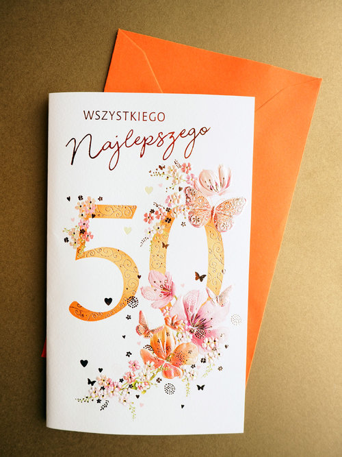 Karnet z okazji 50-tych urodzin, posiada ozdobne wytłoczenia. Błyszczące, metaliczne elementy dodają uroku i elegancji. Wewnątrz karnetu ozdobny środek i życzenia: "Pięćdziesiąt lat to 18262 dni, każdy z nich był inny. Jeden zwyczajny, następny cudowny, każdy dzień miał swoje znaczenie, i warto było żyć. Dlatego należy to odpowiednio uczcić! Wiele szczęścia, zdrowia i miłości, i jeszcze więcej wspaniałych dni z serca życzy..." Format: 11,5x19 cm