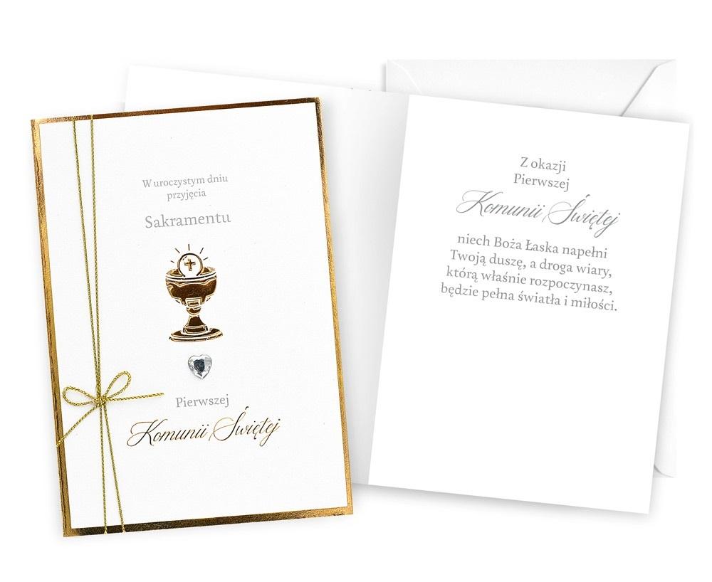 Kartka B6 z ozdobnej serii Dream Cards na Komunię - nieduża, ale robi wrażenie dzięki atrakcyjnej kolorystyce i ciekawym zdobieniom. To idealny wybór łączący przyjazną cenę z jakością. Cechy szczególne: wielkość: B6, 16.6 x 11.7 cm po złożeniu, koperta: w zestawie, biała zdobienia: różnorodne, bogate (w zależności od wzoru: przyklejane dekoracje, elementy biżuteryjne, odstawniki, metaliczne folie, tłoczenia itp.), okazja: Komunia