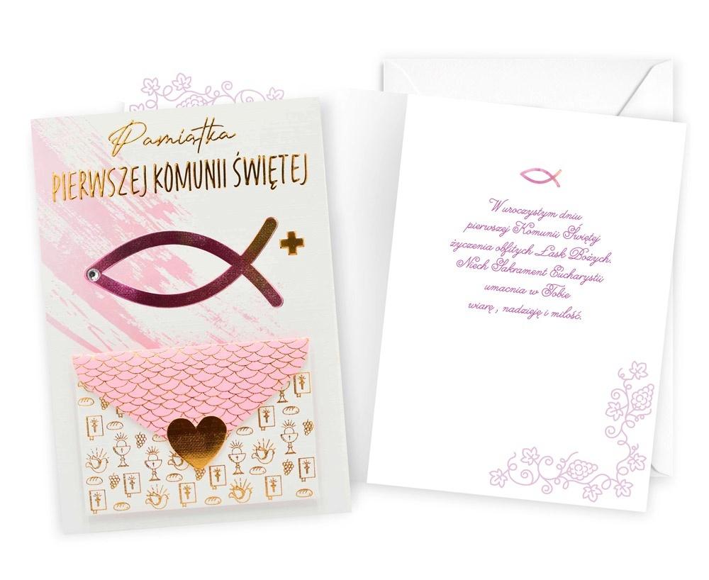 Kartka Dream Cards na I Komunię Świętą DK-1244 Kartka B6 z ozdobnej serii Dream Cards - nieduża, ale robi wrażenie dzięki atrakcyjnej kolorystyce i ciekawym zdobieniom. To idealny wybór łączący przyjazną cenę z jakością. Cechy szczególne: wielkość: B6, 16.6 x 11.7 cm po złożeniu, koperta: w zestawie, kolorowa, zdobienia: kolorowe, różnorodne, bogate (w zależności od wzoru: przyklejane dekoracje, elementy biżuteryjne, odstawniki, metaliczne folie, tłoczenia itp.), okazja: Komunia Święta