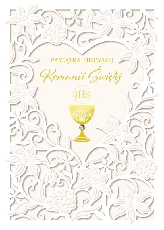 Elegancki karnet na Pierwszą Komunię Świętą w formacie B6 z laserowo wycinanym wzorem. Delikatny, ażurowy motyw z symbolami religijnymi, takimi jak hostia, krzyż czy gołąb. Wewnątrz miejsce na życzenia i dane uroczystości. Idealna pamiątka tego ważnego dnia.