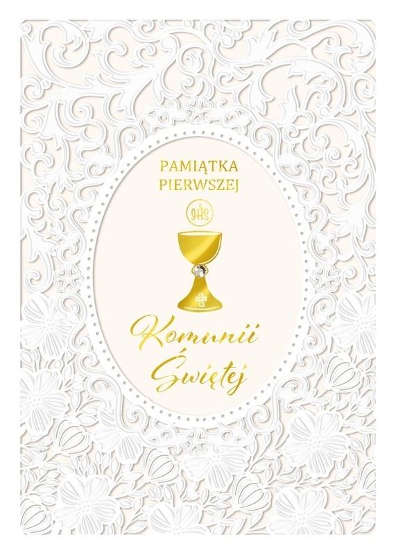 Elegancki karnet na Pierwszą Komunię Świętą w formacie B6 z laserowo wycinanym wzorem. Delikatny, ażurowy motyw z symbolami religijnymi, takimi jak hostia, krzyż czy gołąb. Wewnątrz miejsce na życzenia i dane uroczystości. Idealna pamiątka tego ważnego dnia.