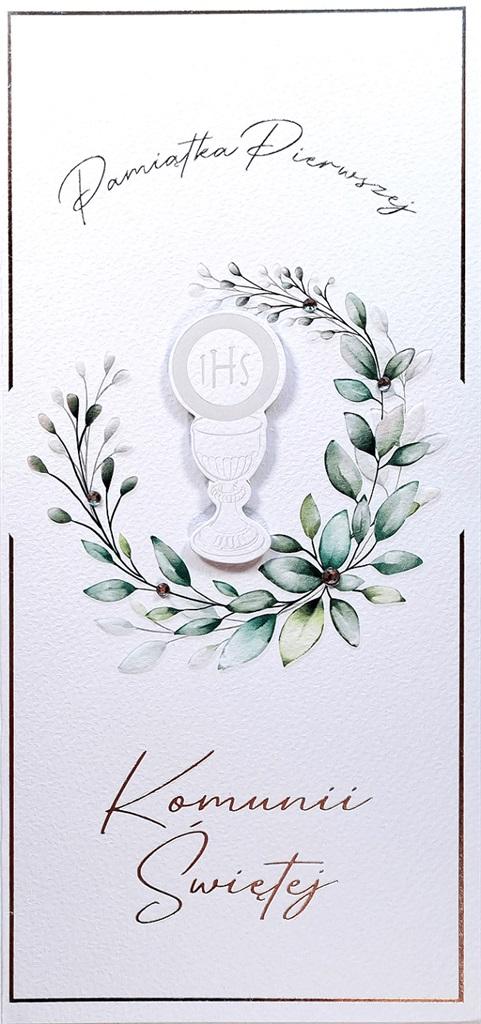 Karnet okolicznościowy z kopertą i życzeniami w środku.