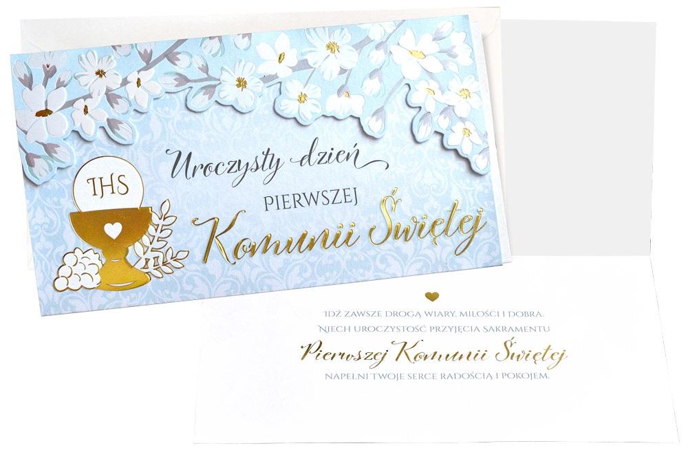 Każda kartka w kolekcji Passion Moments to małe arcydzieło - wyjątkowe i niepowtarzalne, piękne wizualnie. Kartki PM są bardzo bogato zdobione, a jednocześnie skromne i stylowe, cały efekt tkwi w detalach i doskonałym wykonaniu. W zależności od wzoru, na kartkach znajdują się dekoracje ze złotej, srebrnej, perłowej lub holograficznej folii, a także doklejki biżuteryjne, kokardki, laserowe wycięcia, wstążeczki i inne dodatki. Wnętrze karnetu to zawsze atrakcyjna grafika i tekst życzeń. Kartki mają w komplecie dopasowaną kopertę. Cechy szczególne: zdobienie: przynajmniej dwie folie (metaliczne/perłowe/holograficzne), elementy doklejane, wycięcia laserowe, wstążeczki - w zależności od wzoru, wnętrze: z delikatną grafiką, wyjątkowe życzenia w środku, w komplecie: dopasowana kolorystycznie koperta, okazja: komunia Wymiary karnetu po złożeniu: 11,4 x 21,5 cm.