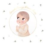 Karnet kwadratowy 15 x 15 cm z wyciętym kółkiem. Złocony i tłoczony, teksy życzeń w środku. Wydrukowany na wysokiej jakości papierze. W zestawie bilecik do prezentu oraz koperta.