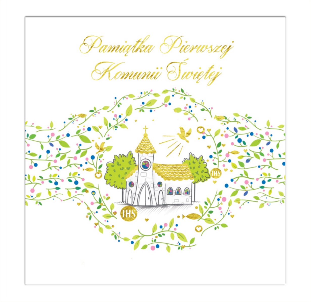 Karnet kwadratowy 15 x 15 cm. Złocony i tłoczony, teksy życzeń w środku. Wydrukowany na wysokiej jakości papierze. W zestawie koperta.