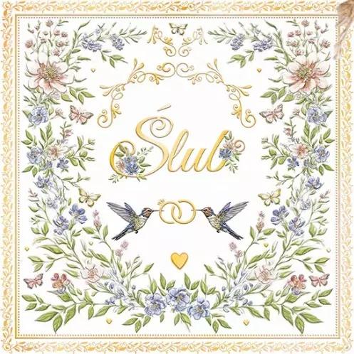 Karnet kwadratowy 15 x 15 cm. Złocony i tłoczony, teksy życzeń w środku. Wydrukowany na wysokiej jakości papierze. W zestawie koperta.