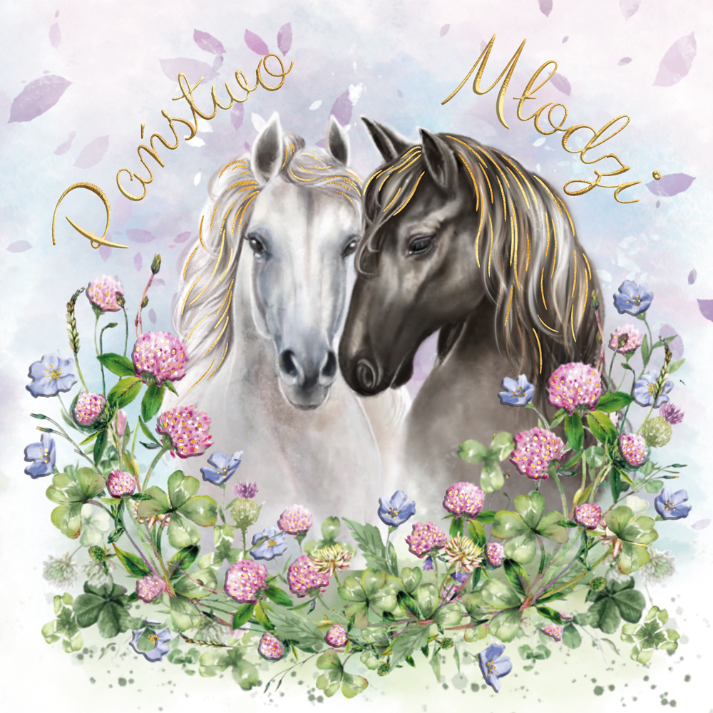 Składany z trzech stron kwadratowy karnet o wymiarach 15 x 15 cm. Złocony i tłoczony, teksy życzeń w środku. Wydrukowany na wysokiej jakości papierze. W zestawie koperta.