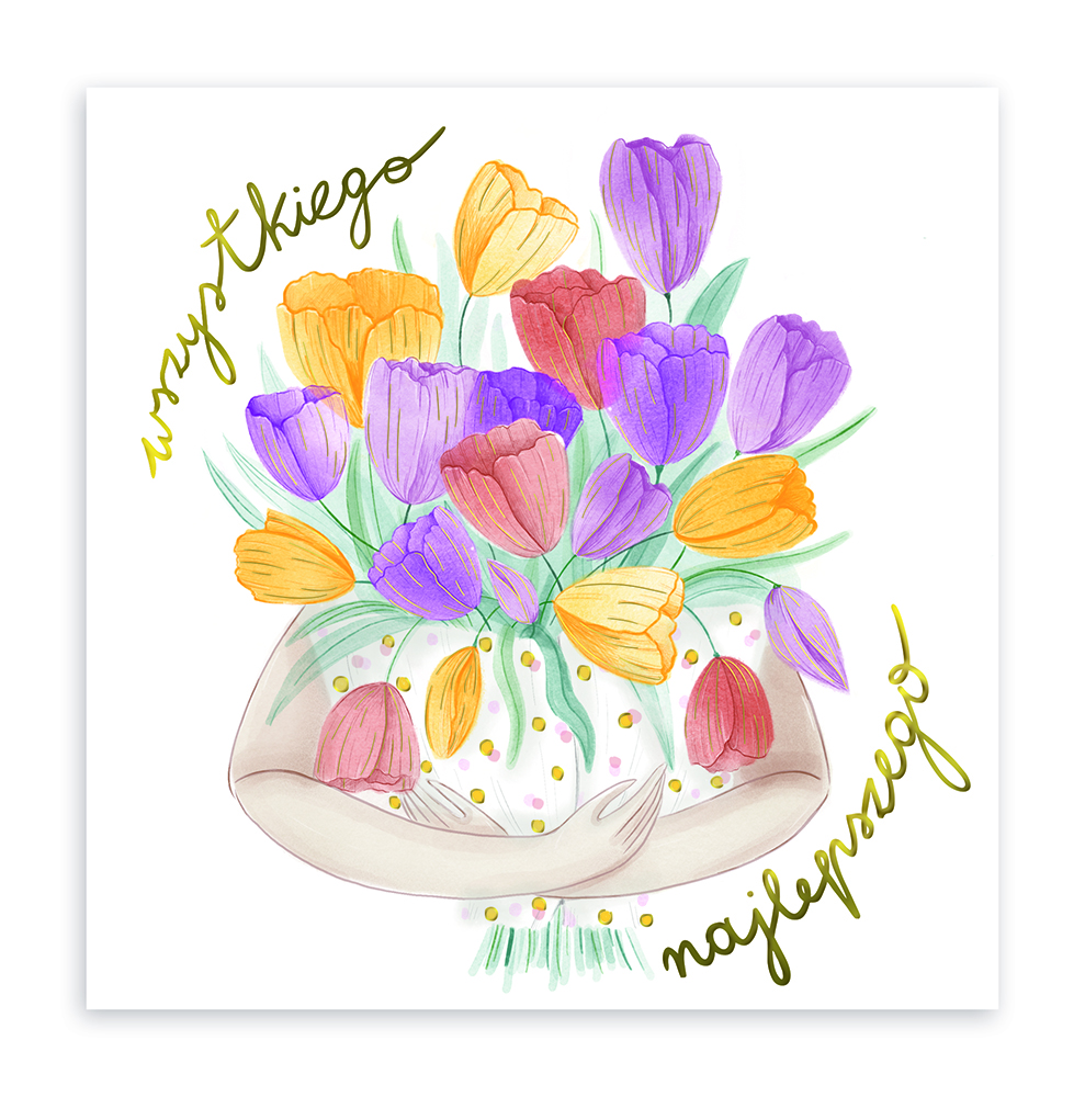 Karnet w formacie 15 x 15 cm. Wydrukowany na wysokiej jakości papierze. Karnet ZŁOCONY. W zestawie kolorowa koperta.