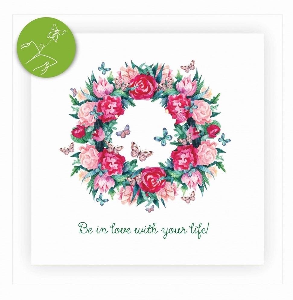 Karnet w formacie kwadratu (15x15cm) z niespodzianką. Po otwarciu karnetu wylatuje z niego papierowy motylek. Wspaniała niespodzianka dla osób poszukujących oryginalnego i efektownego prezentu. Do karnetu dołączona jest instrukcja obsługi. Wyprodukowany na Litwie.