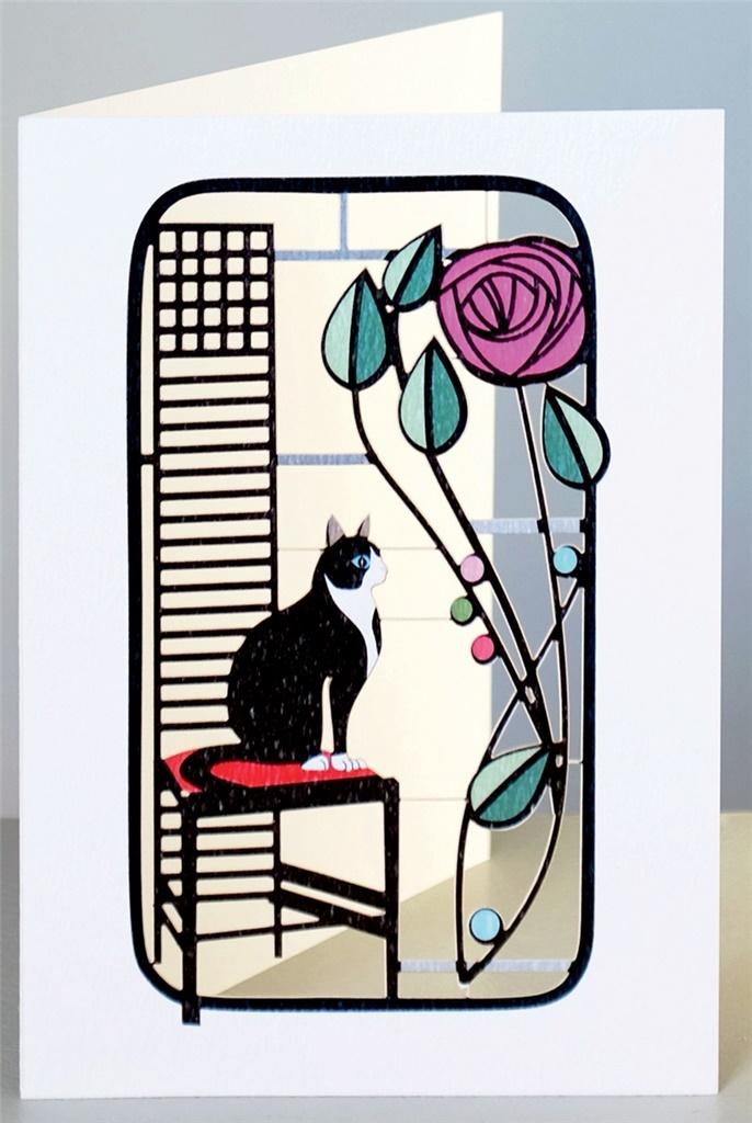 Karnet MC01 wycinany + koperta Kot na krześle róża