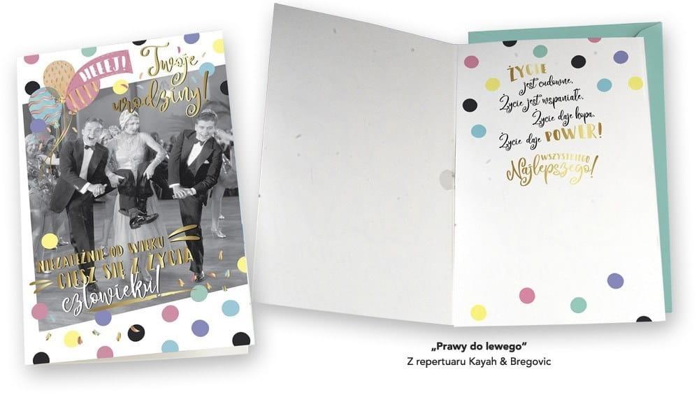 Kartka z niepowtarzalnymi, zabawnymi grafikami, a w środku znane muzyczne nagrania, np. Jesteś szalona"", ""Prawy do lewego"" czy ""Bałkanica"".