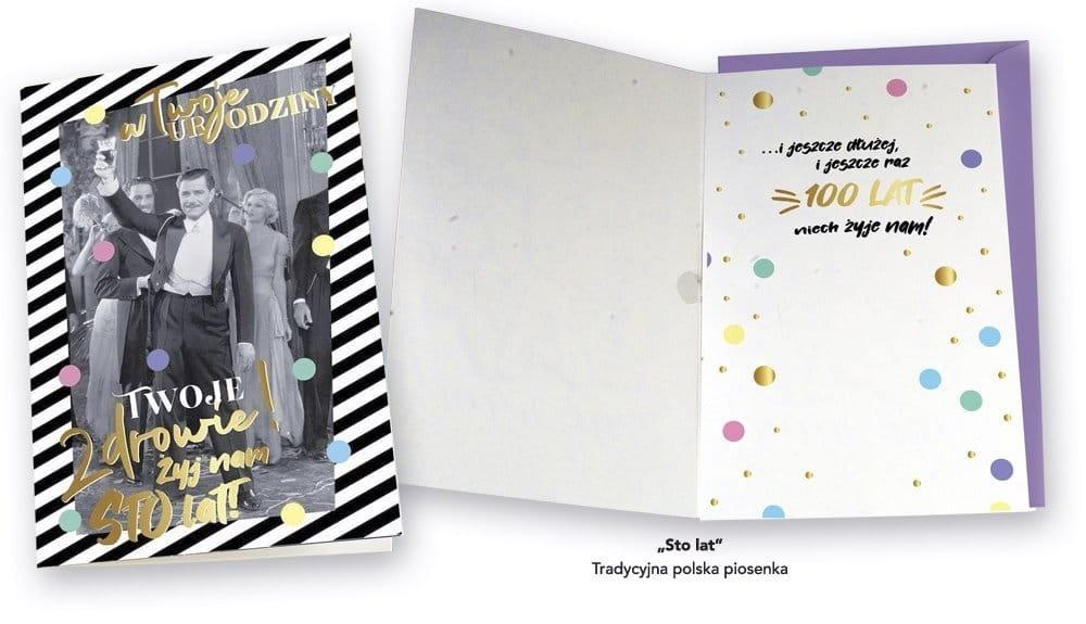 Kartka z niepowtarzalnymi, zabawnymi grafikami, a w środku znane muzyczne nagrania, np. Jesteś szalona"", ""Prawy do lewego"" czy ""Bałkanica"".