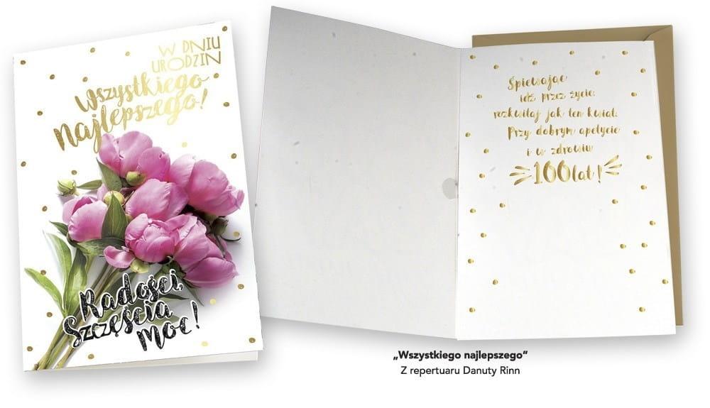 Kartka z niepowtarzalnymi, zabawnymi grafikami, a w środku znane muzyczne nagrania, np. Jesteś szalona"", ""Prawy do lewego"" czy ""Bałkanica"".