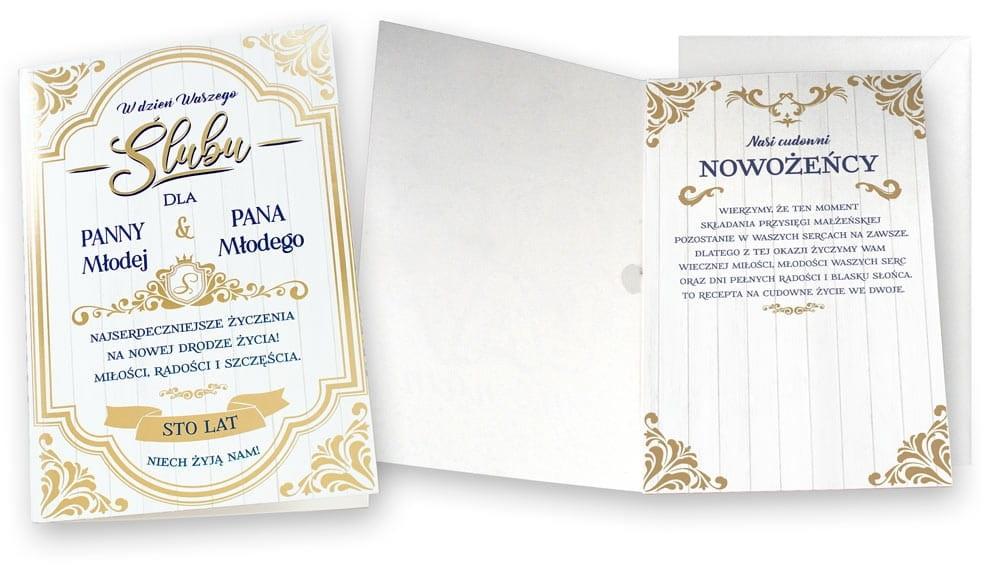 Kartka muzyczna na Ślub MP-0030. Kartki z serii Simfonica wyróżniają się nie tylko wielkością i pięknym wzorem, ale także niespodzianką w środku - po otwarciu kartki uruchamia się znane muzyczne nagranie "Marsz weselny Felixa Mendelssohna-Bartholdyego Wymiary karnetu po złożeniu: 15cm x 22,5 cm, zdobiony w zależności od wzoru złotą folią lub cholograficzną. Każda kartka posiada życzenia w środku i koperte.