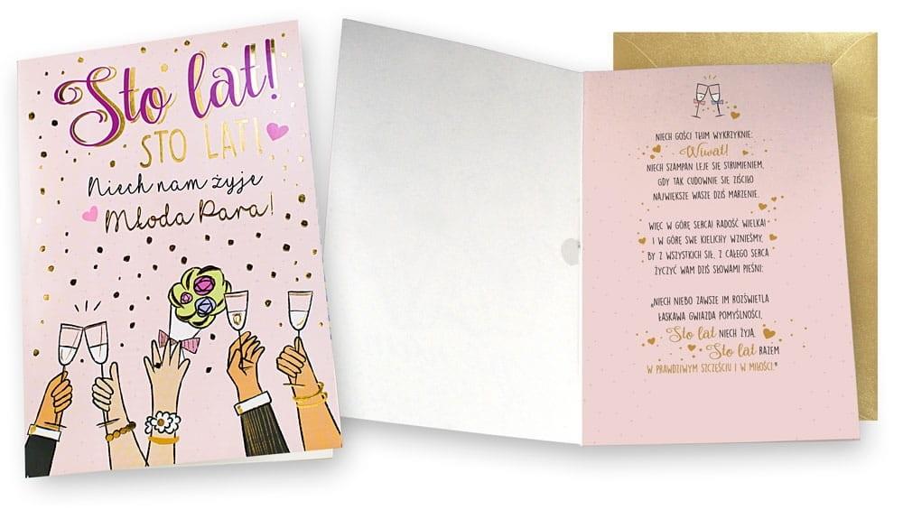 Kartka muzyczna na Ślub MP-0036. Kartki z serii Simfonica wyróżniają się nie tylko wielkością i pięknym wzorem, ale także niespodzianką w środku - po otwarciu kartki uruchamia się znane muzyczne nagranie "Sto lat Tradycyjna polska piosenka Wymiary karnetu po złożeniu: 15cm x 22,5 cm, zdobiony w zależności od wzoru złotą folią lub cholograficzną. Każda kartka posiada życzenia w środku i koperte.