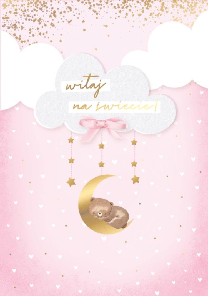 Karnet DK-1303 Narodziny (dziewczynka, miś, półksiężyc)