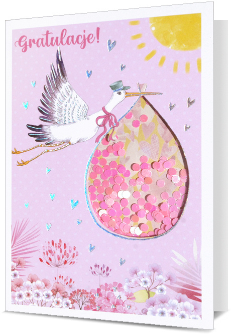 Kartka jest bogato i różnorodnie zdobiona (zależnie od wzoru: metaliczna folia, lakier perłowy,