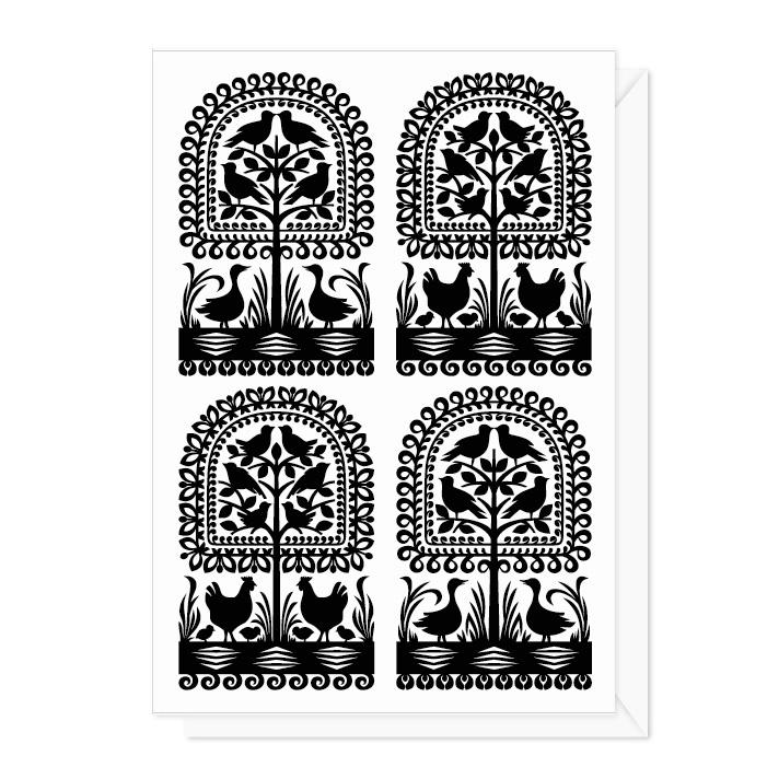 Kurpiowska kartka FOLK leluje z wycinanki: doskonały FOLK prezent,sztuka ludowa to idealna pamiątka z Polski,inspiracją FOLK karty okolicznościowej były lasy kurpiowskie wycinanki przedstawiające drzewa oraz zwierzęta, ułożone w kilku rzędach, jedno nad drugim,podstawowymi motywami kurpiowskich wycinanek są drzewka kwiatowe, symbolizujące łącznik między niebem a ziemią, postacie kobiece, będące symbolem pramatki ziemi oraz motyw koguta, symbolizującego płodność,druk wzoru na zewnątrz, wnętrze bez zadruku specjalnie na Twoje indywidualne życzenia świąteczne,w komplecie koperta w kolorze czerwonym,całość zapakowana w folijkę