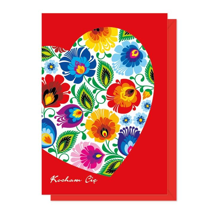 Kartka łowicka FOLK SERCE kwiaty z wycinanki: doskonały FOLK prezent,