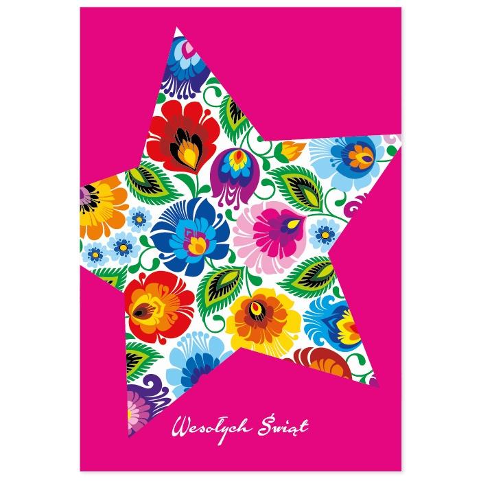 Kartka świąteczna GWIAZDKA Boże Narodzenie na ludowo wycinanka łowicka: doskonały FOLK prezent,sztuka ludowa to idealna pamiątka z Polski,łowickie wzory ludowe są najbardziej rozpoznawanym motywem ludowym w Polsce,podstawowymi elementami wycinanek łowickich są koguty, pawie oraz wielobarwne kwiaty,druk wzoru na zewnątrz, wnętrze bez zadruku specjalnie na Twoje indywidualne życzenia świąteczne,w komplecie koperta w kolorze czerwonym,całość zapakowana w folijkę