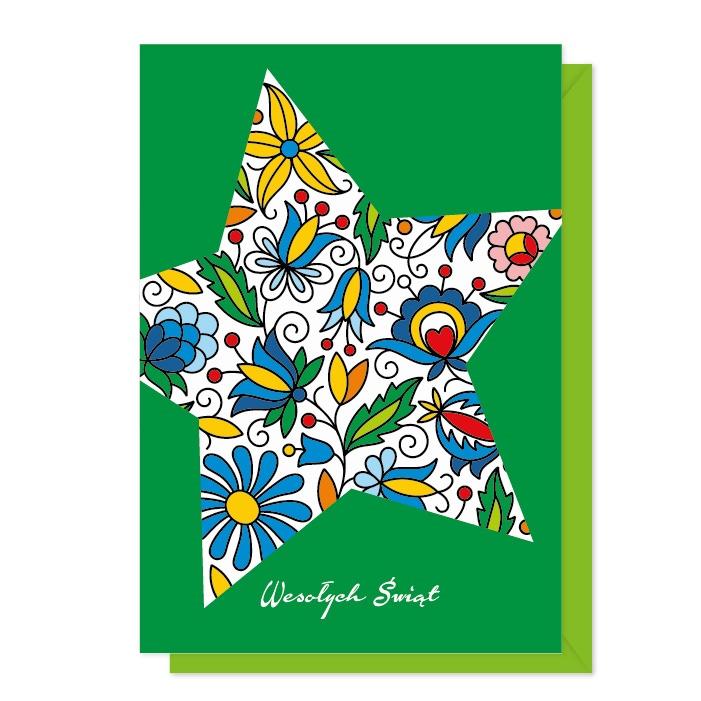 Kartka świąteczna Boże Narodzenie GWIAZDKA na ludowo hafty kaszubskie: inspirowana tradycyjnymi haftami kaszubskimi,doskonały FOLK prezent,sztuka ludowa to idealna pamiątka z Polski,tradycyjny haft kaszubski wykonywany jest ręcznie,motywem przewodnim wśród kaszubskich wzorów kwiatowych są: goździki, bratki, koniczynki, chabry, niezapominajki, dzwonki, lilie i róże,druk wzoru na zewnątrz, wnętrze bez zadruku specjalnie na Twoje indywidualne życzenia świąteczne,w komplecie koperta w kolorze zielonym,