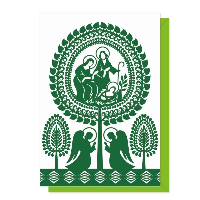 Kartka świąteczna RODZINA Boże Narodzenie na ludowo wycinanka leluja kurpiowska: święta Rodzina wkomponowana w wycinankę w stylu kurpiowskim,sztuka ludowa to idealna pamiątka z Polski,inspiracją karty świątecznej jest ""leluja"" kurpiowska wycinanka przedstawiająca drzewo,