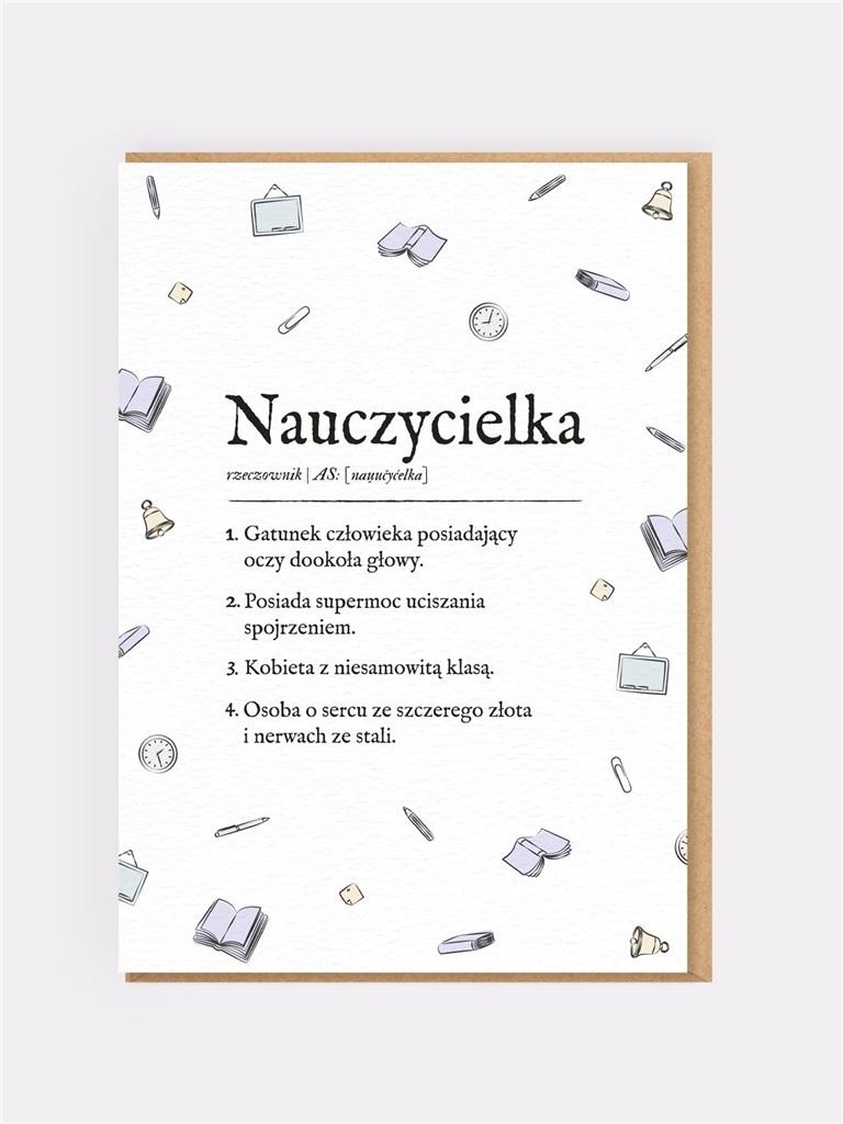 Zaskocz swoją nauczycielkę kartką, która oddaje jej prawdziwą supermoc! Nasza definicja nauczycielki opisuje kobietę z nerwami ze stali i umiejętnością uciszania spojrzeniem, która prowadzi klasę z niesamowitą klasą. Ta kartka to idealny sposób, by docenić jej wyjątkową zdolność do zarządzania chaosem oraz pasję, którą wkłada w codzienne nauczanie. Śmieszna, a zarazem pełna szacunku - bo każda nauczycielka zasługuje na wyjątkowy gest wdzięczności! Kartka okolicznościowa z podziękowaniami dla nauczycielki Wymiary kartki (po złożeniu): 12 cm 17 cm Gramatura papieru: 250 g/m2 W zestawie elegancka koperta z eko kraftu Wymiary koperty: 12,5 cm 17,5 cm Gramatura koperty: 100 g/m2 Zestaw zapakowany w folię Wyprodukowano w Polsce.