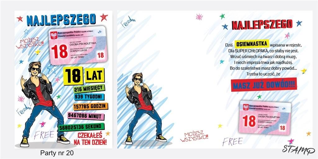 Karnet okolicznościowy z okzaji 18 Urodzin z naklejką w formie dowodu osobistego. W zestawie znajduje się koperta.