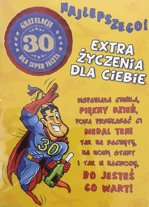 Humorystyczny karnet z okazji 30 urodzin. Opakowanie zawiera 2 sztuki karnetu.