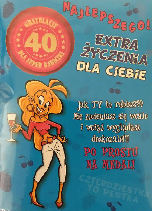 Humorystyczny karnet z okazji 40 urodzin. Opakowanie zawiera 2 sztuki karnetu.