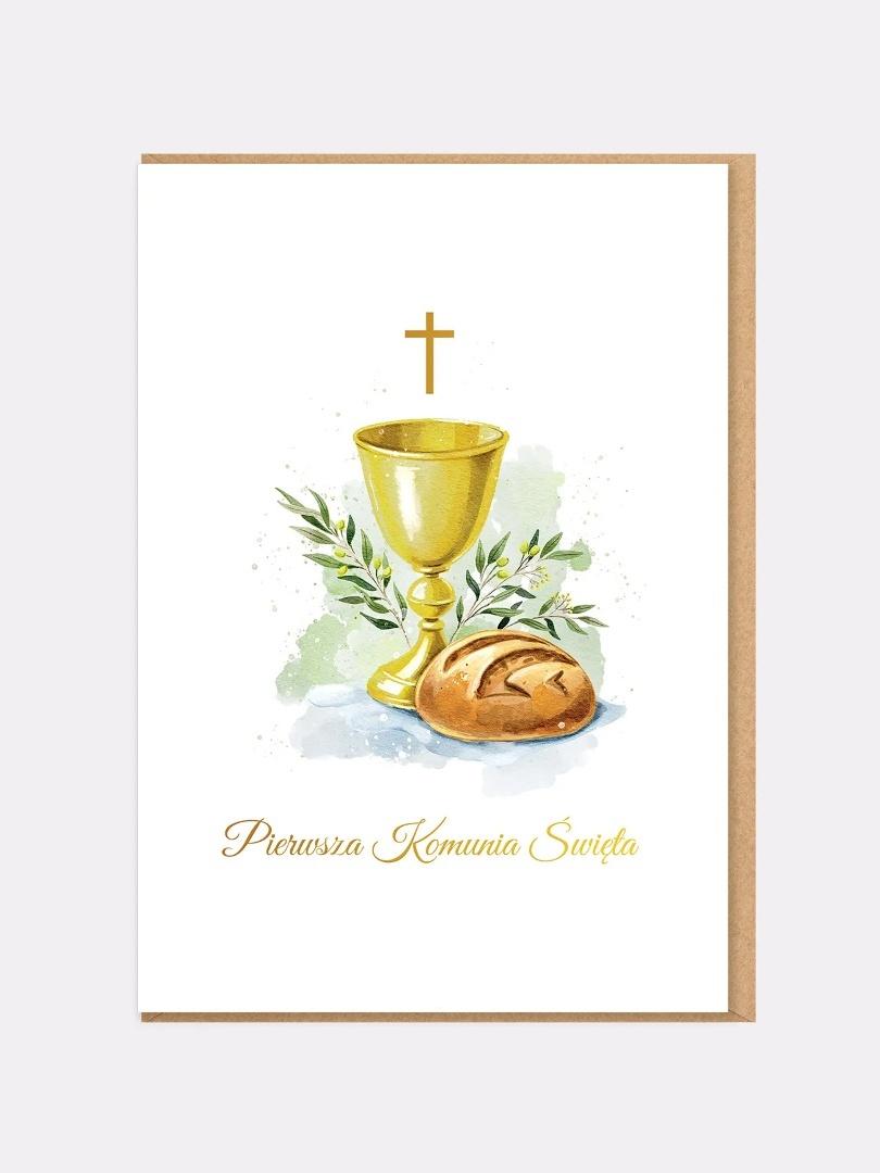 Elegancka kartka komunijna z symboliczną ilustracją kielicha, chleba i krzyża to klasyczna i ponadczasowa propozycja na Pierwszą Komunię Świętą. Delikatna, akwarelowa grafika podkreśla duchowy charakter wydarzenia i sprawia, że to wyjątkowa kartka na komunię, która będzie piękną pamiątką tego dnia.