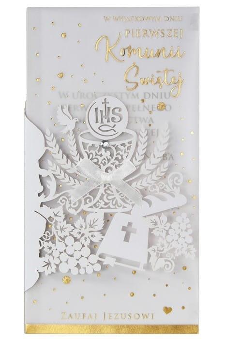 Każda kartka w kolekcji Passion Moments to małe arcydzieło - wyjątkowe i niepowtarzalne, świetne w dotyku, piękne wizualnie, po prostu niepowtarzalne. Kartki PM są bardzo bogato zdobione, a jednocześnie skromne i stylowe, cały efekt tkwi w detalach i doskonałym wykonaniu. W zależności od wzoru, na kartkach znajdują się dekoracje ze złotej, srebrnej, perłowej lub holograficznej folii, a także doklejki biżuteryjne, kokardki, brokat, laserowe wycięcia, wstążeczki i inne dodatki. Wnętrze karnetu do zawsze atrakcyjna grafika i tekst życzeń. Kartki mają w komplecie dopasowaną kopertę. Cechy szczególne: zdobienie: przynajmniej dwie folie (metaliczne/perłowe/holograficzne), brokat, elementy doklejane, wycięcia laserowe, wstążeczki - w zależności od wzoru, wnętrze: kolorowe, z delikatną grafiką, wyjątkowe życzenia w środku, w komplecie: dopasowana kolorystycznie koperta, okazja: komunia.