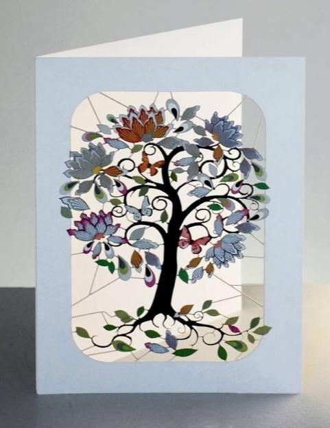 Karnet laserowo wycinany z kopertą. Z tyłu miejsce na życzenia. Wyprodukowany w Wielkiej Brytanii.
