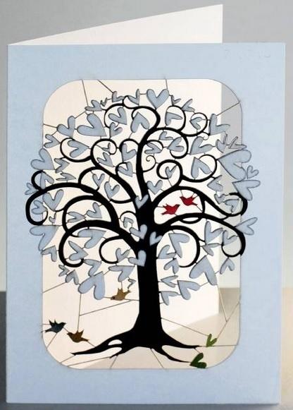 Karnet PM246 wycinany + koperta Białe drzewo ptaki