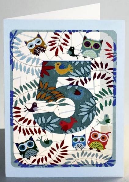 Karnet PM795 wycinany + koperta Urodziny 5 sowy