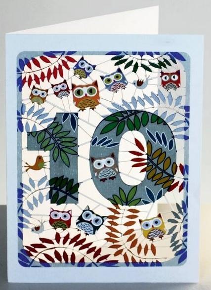Karnet PM810 wycinany + koperta Urodziny 10 sowy