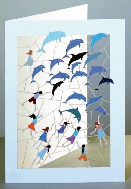 Karnet PP026 wycinany + koperta Pływanie delfiny