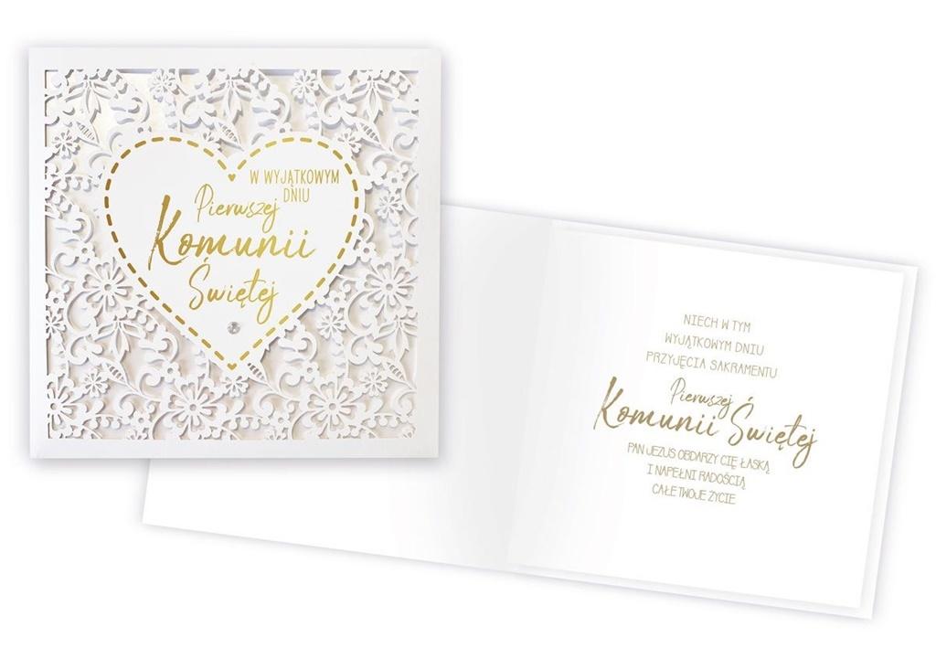 Kartki z serii Primus, to kartki najwyższej jakości, pięknie zdobione m.in złotą lub srebrną folią,tłoczeniami, czy wycinkami laserowymi. Idealne na najważniejsze okazje w życiu, takie jak ślub, komunia. W środku każdej kartki znajdują się dobrane do okazji życzenia, a do kartki dołączona jest dopasowana koperta. Cechy szczególne: wielkość: niestendardowa, prostokątna, kwadratowa, zdobienia: dekoracje ze złotej folii, doklejane koraliki, tłoczenia koperta: dopasowana w komplecie, wnętrze kartki: życzenia w środku, okazja: komunia.